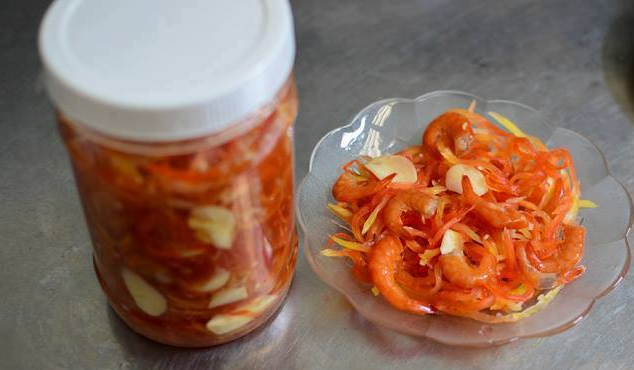 Một món ăn nữa không thể thiếu trong mâm cỗ ngày Tết của người miền Trung đó chính là tôm chua, đặc sản của Huế.